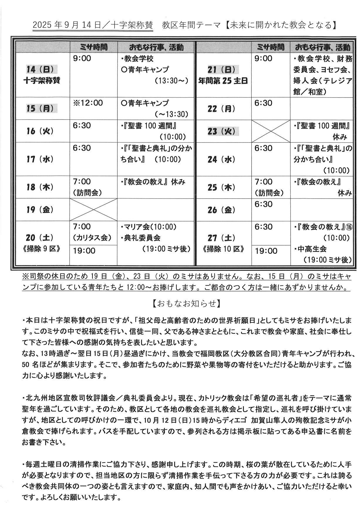 2025年 9月 14日 十字架称賛のお知らせ