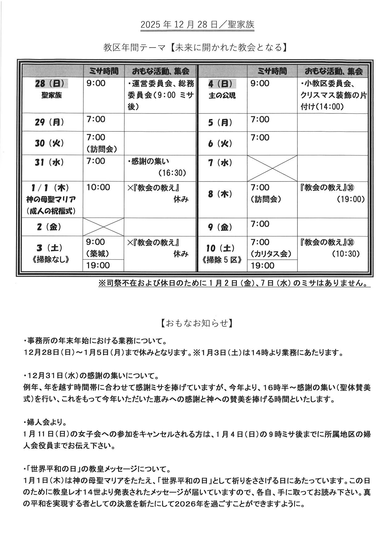 2025年 12月 28日 聖家族のお知らせ