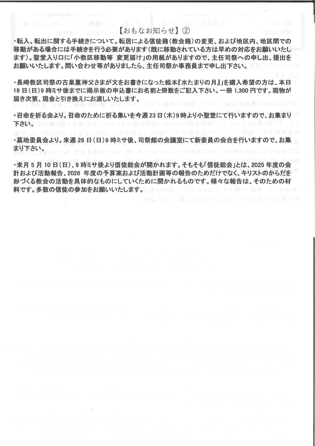 2026年 4月 19日 復活節第3主日(裏面)のお知らせ